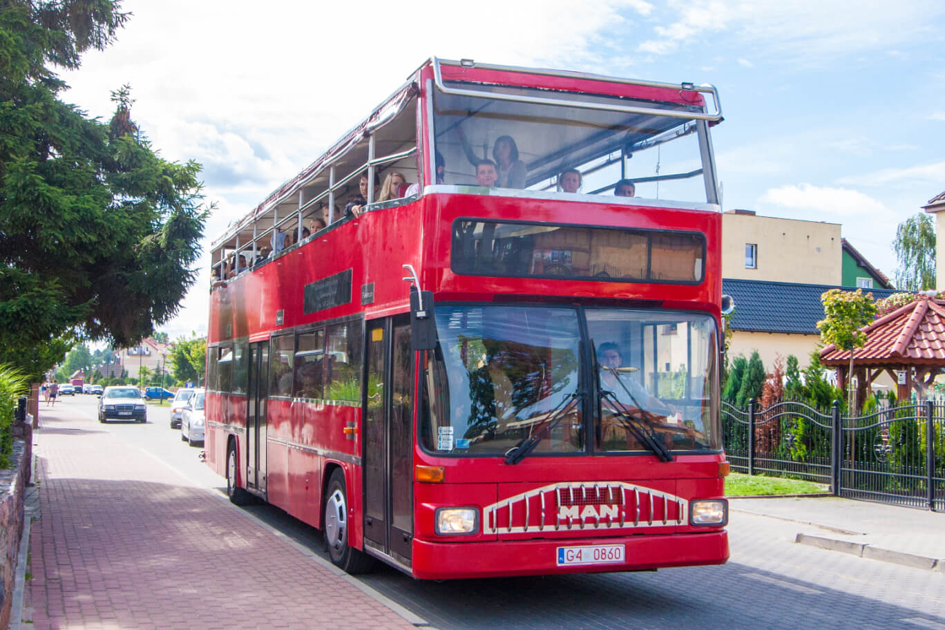 Autokar piętrowy własnego projektu stworzony w naszym warsztacie, górny pokład pozbawiony szyb, unikalny design sprawią niesamowitą frajdę a zwiedzanie pobliskich miejscowości na pewno pozostanie na długo w pamięci.>